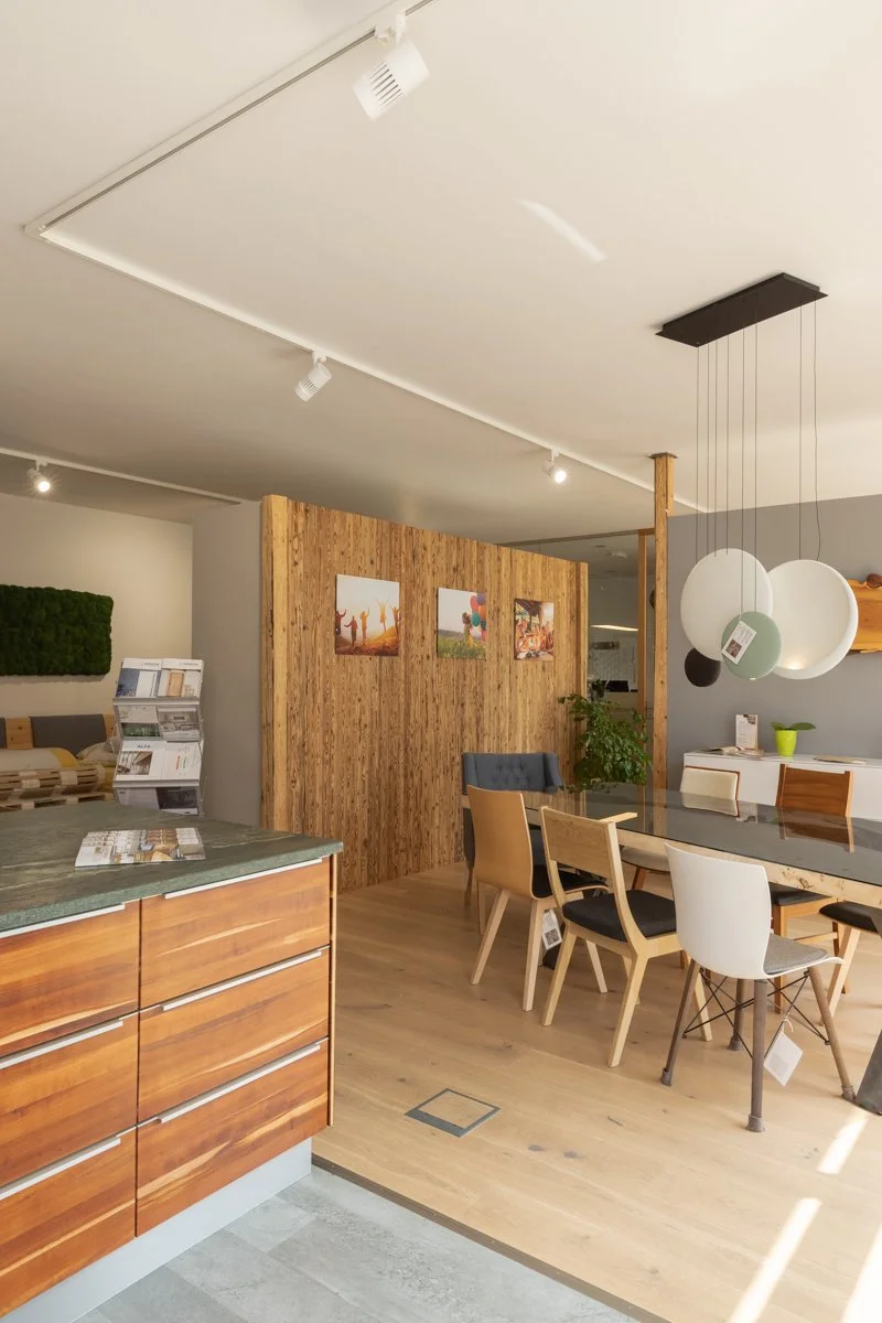 In unserem Möbelraum könnt ihr euch hochwertige Vollholzküchen mit Essecken ansehen.